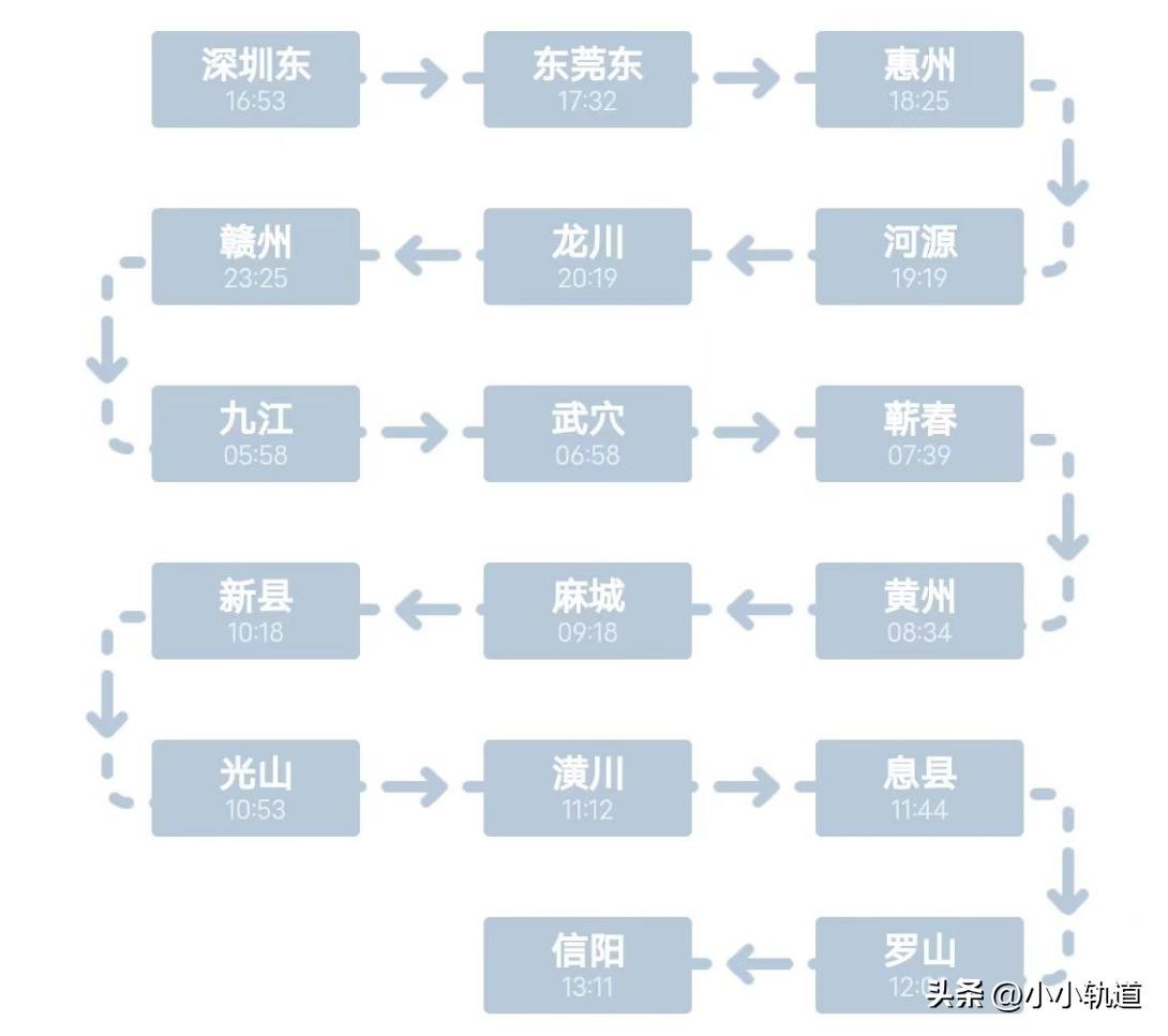 本次列车16:53从深圳东出发,次日13:11到达信阳,中间一共停靠15个站(详情见图),全程1492公里,运行时长20小时18分钟。列车由武汉局担当,25G型客车(G代表是25型客车的改进型,最大运行速度是120公里每小时)。