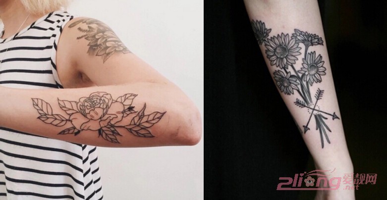 这两款花臂纹身相比较之下稍显内敛,干净纯洁的花朵造型并没有蔓延整个手臂,恰到好处的纹身位置看起来并不张狂,反而更显秀气。