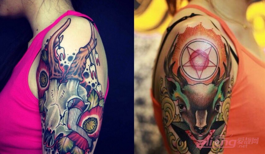 动物图案的花臂纹身也是不少喜爱纹身的朋友们的心头好,栩栩如生的山羊头图案富有强者之意,抽象的色彩搭配为整体效果加分不少,个性非常独特。