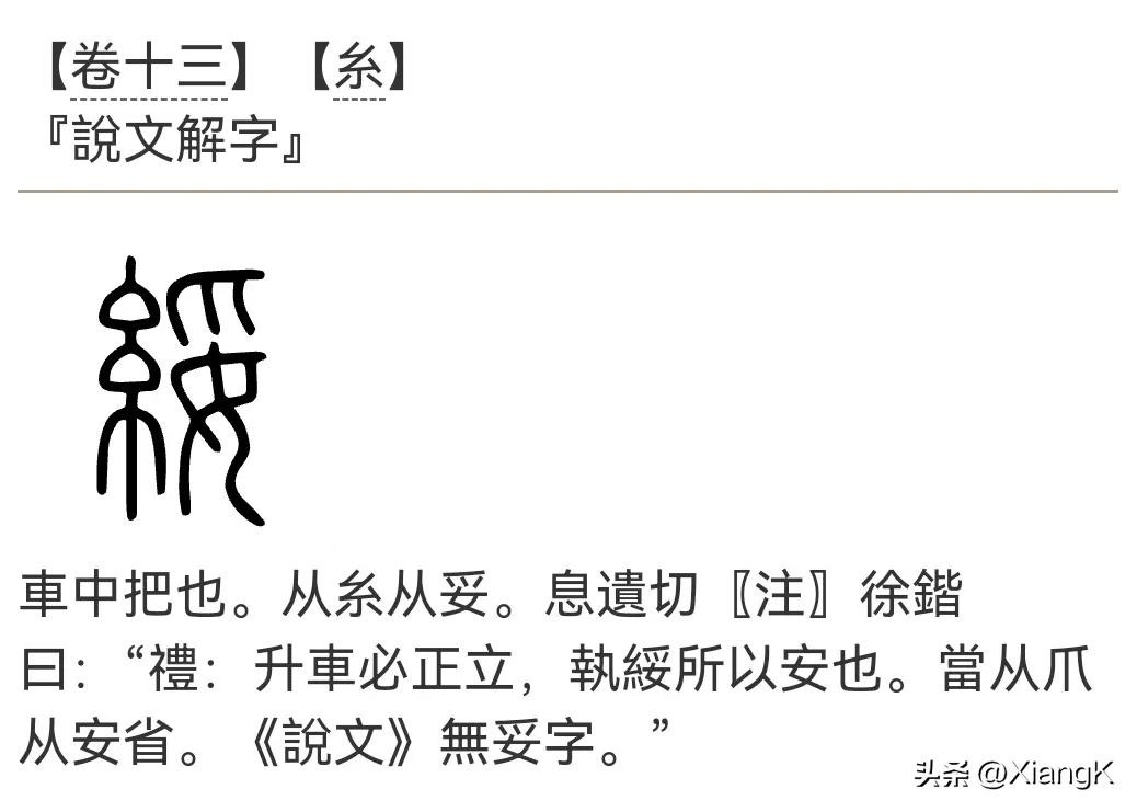 「说文解字」中: 車中把也。从糸从妥。息遺切〖注〗徐鍇曰:“禮:升車必正立,執綏所以安也。當从爪从安省。《說文》無妥字。”
