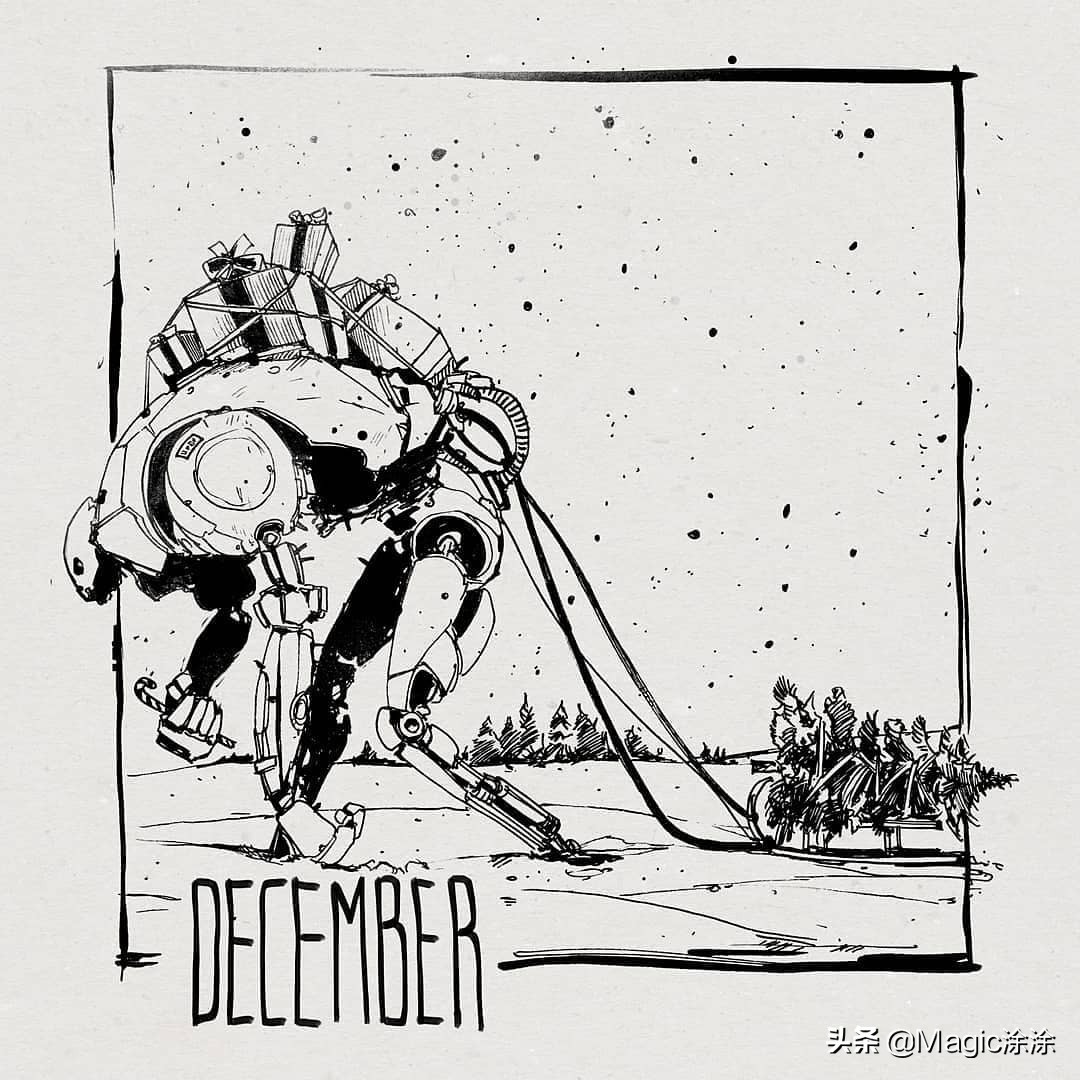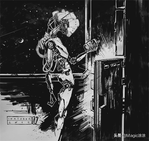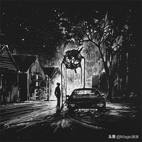 在第一张图中,作者用线条画出大面积的黑色,突出逆光的场景,整幅作品视觉感很强,里面的人物注视着不明机器人,更是让人仿佛来到了一个科幻场景。