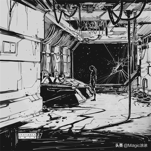 第二张图和第一张图相反,用线条表现出飞船内部的构造,画面的纵深感很强,一个孤独无助的人面对着安全舱,玻璃右侧碎裂的痕迹让人能感受到一种无能为力的感觉。