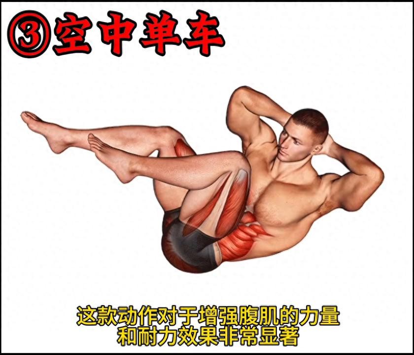 ·第三个:空中单车。这款动作对于增强腹肌的力量和耐力效果非常显著,适合各个年龄段的朋友们进行锻炼。