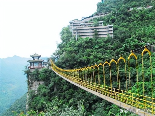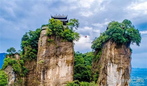 丹霞地貌景区,山上有山,山顶平地拔三座高峰,上有“铁索飞渡”,真人走钢索,惊险刺激。三座高峰下有云岩寺,佛道二教各占一半,颇有特色。
