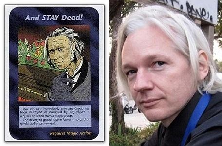 这张卡片名字叫“一直死着吧!”大部分人都认为这张是预告朱利安·阿桑奇的死亡结局,大部分人可能不知道阿桑奇是谁,朱利安·阿桑奇是著名爆料网站《维基解密》创办人、首席编辑与发言人。