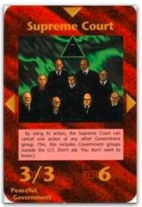 这张卡片叫“最高法院”直接看图大家应该都能看懂,光明会的标志压在了9个人的头上,而美国联邦最高法院就是由9位大法官组成,每个大法官都是由美国总统提名,经过参议院听证后表决批准委任,任期无限。