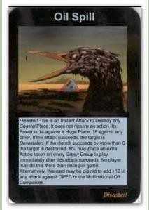 这张卡牌的名字是“漏油事件”近年来最严重的一次漏油事故就是2010年墨西哥湾漏油事故了,英国公司租用的的外海钻油平台故障并爆炸,导致此次漏油事故发生。