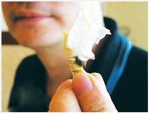 5、用勺柄将蟹身中间一个呈六角形的片状物挑出来,那是蟹心部分,丢弃;