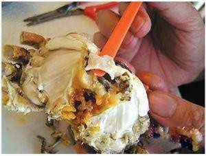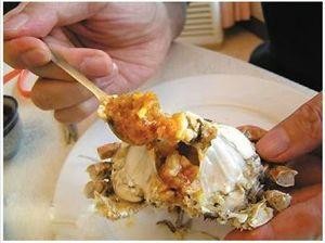 3、先吃蟹盖部分,用小勺把中间的蟹胃部分舀出,轻轻将外面包裹着的蟹黄吮干净。
