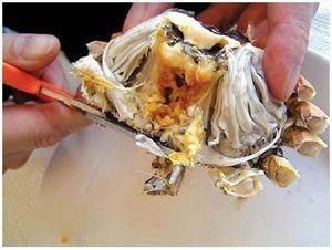 10、前两段都可将蟹壳直接剪开,用勺舀出肉。技巧是剪开两边,然后用手往相反的方向掰两只钳脚,钳壳就完整的分开了;