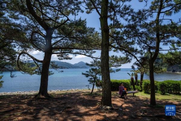 6月12日,在日本静冈县贺茂郡西伊豆町堂之岛公园,一名游客坐在海边。伊豆八景之一的堂之岛位于伊豆半岛西海岸的海湾内,有许多小岛星罗棋布地散落其间。