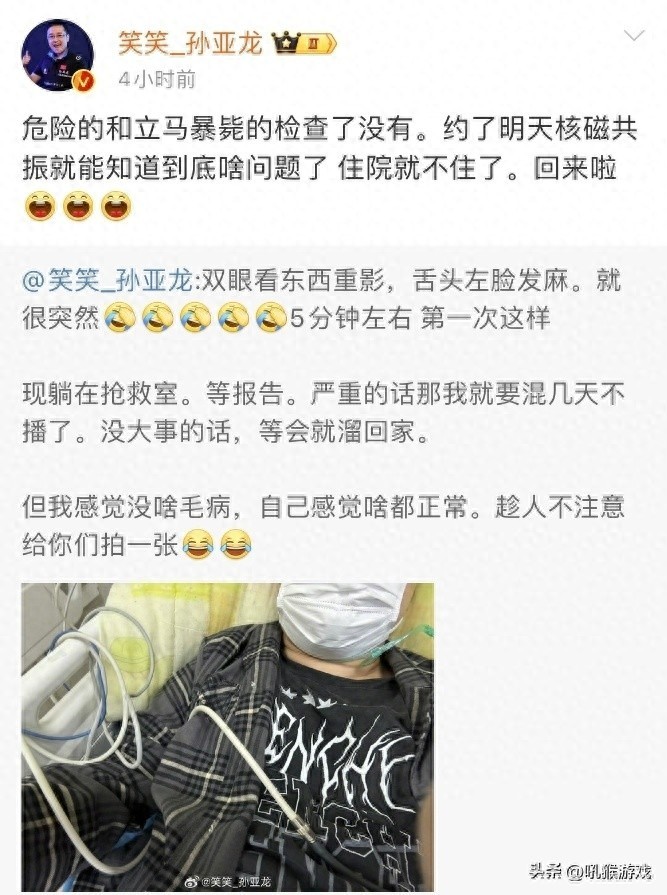 笑笑孙亚龙中风住院,两天前发文:舌头左脸发麻
