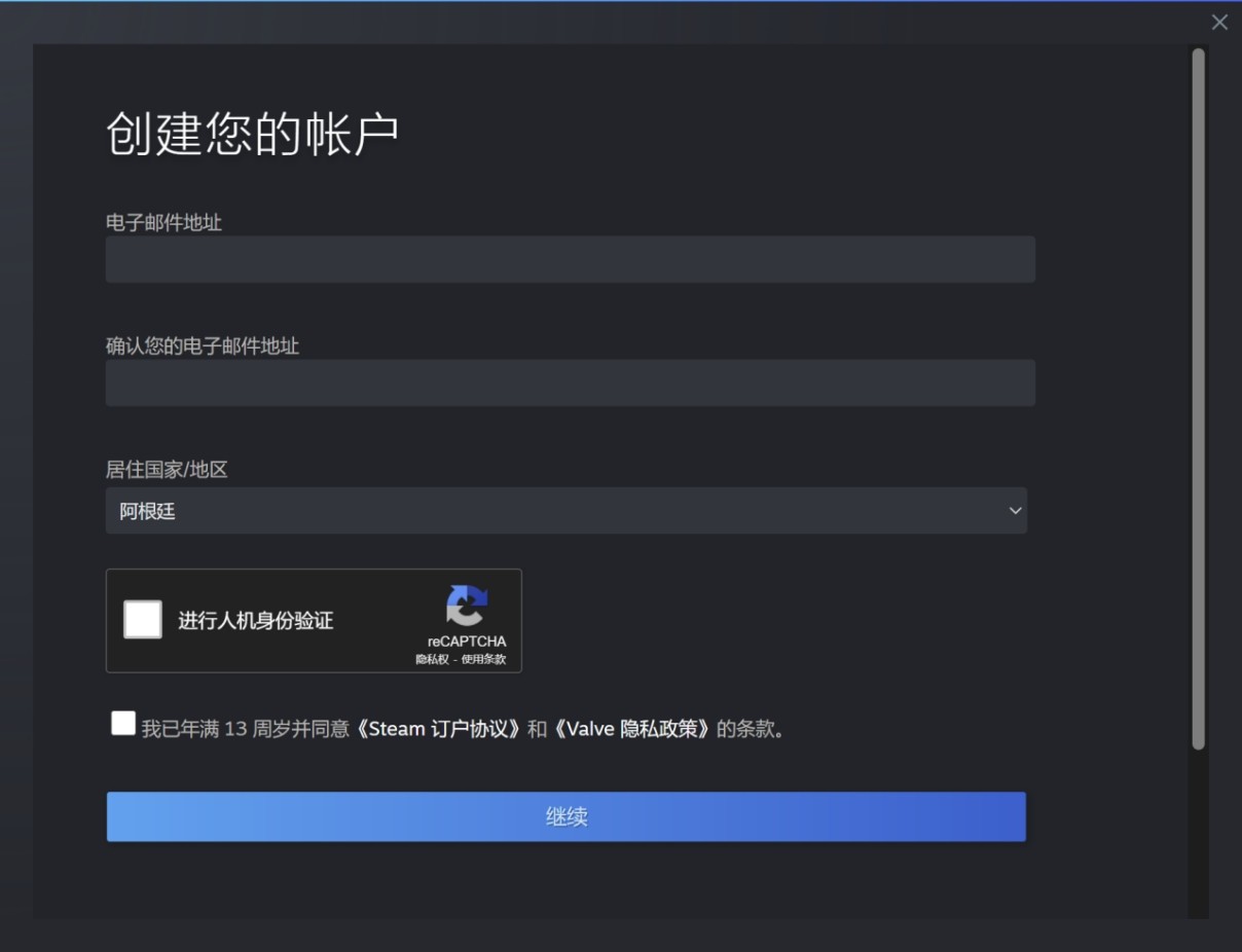 3、点击之后开始注册steam账号,需要填写一些基本的个人信息,包括地区、邮箱地址等等,填写完成之后,提交注册申请,若是需要人机验证,则按照页面的提示来进行验证即可。