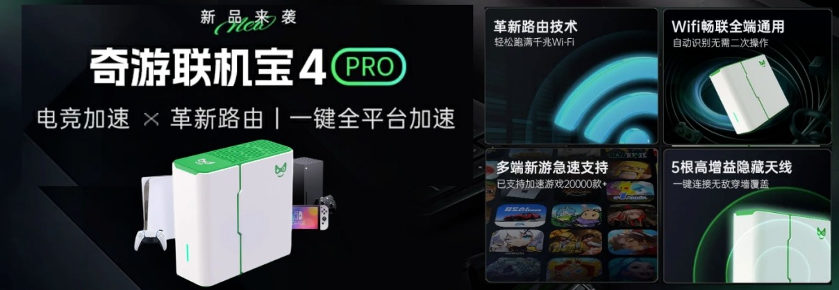 联机宝4Pro今日正式发布,WiFi6-AX3000电竞级加速盒,兼具WiFi6功能路由,一键适配PC、主机、移动三端满足你的所有游戏需求。