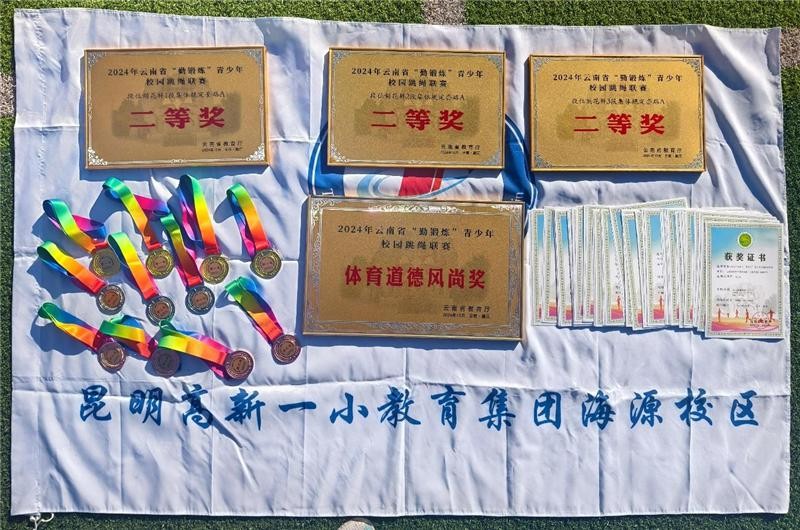 掌上春城讯近日,昆明高新一小教育集团海源校区代表队在墨江举行的2024年云南省“勤锻炼”青少年校园跳绳联赛中,夺得个人项目中4金、3银、3铜奖牌。