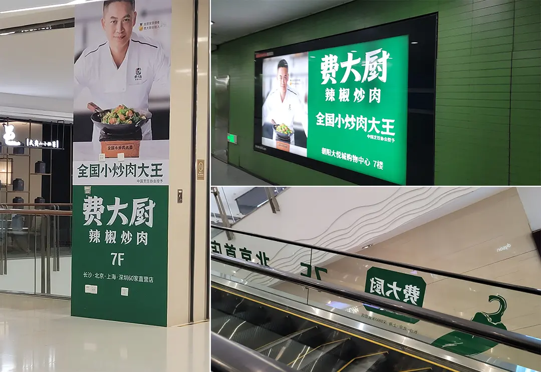 从地铁开始,到扶梯、商场海报,炎炎夏日,费大厨用极具辨识度的绿色系霸屏商场,从视觉上占尽先机。