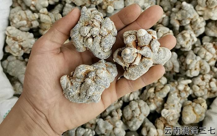 这三七原料,不但是本地春三七,而且云南文山产地、山地里,生长时间长的老三七,水洗晾干,比较干后的原三七头,比一般三七普通三七,都要好些。
