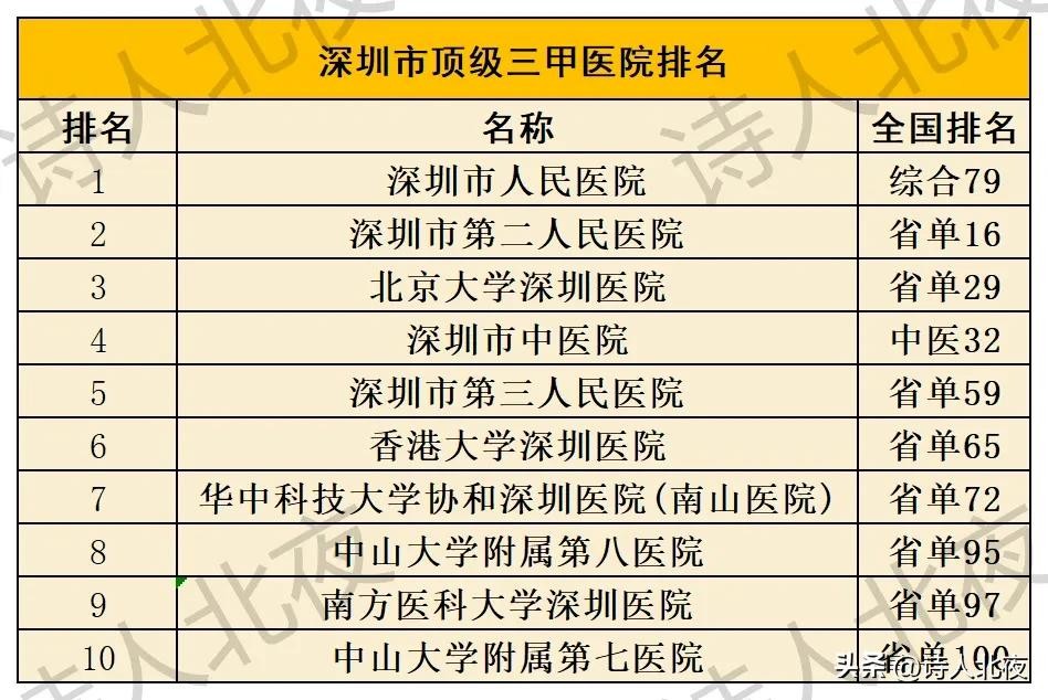 以上就是深圳市顶级三甲医院前10名,其中排名第1位的深圳市人民医院进入全国医院100强,其余8所综合医院全都位列全国省单医院100强,深圳市中医院在全国中医院系统中排名第32位,对于深圳市这座年轻的城市来讲,这份成绩足以骄傲,这些成立时间尚短的医院必将随着深圳经济的蓬勃发展而大步前进,相信不久之后有更多三甲医院列入全国综合百强!