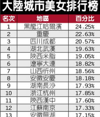 上面这份榜单系内地网友投票评选的结果,传统“豪门”重庆和成都位列第二第三,而黑龙江哈尔滨成为中国美女最多的城市,排行榜一出,立马引来很多网民的激烈热议,很多人想不明白为什么哈尔滨能够排第一,据说此榜单系黑龙江某新闻网站制作排名,所以哈尔滨排名第一,可以说是“实至名归”啊!而小编所在的城市维护,排名第四,可小编在武汉大街上也没看到几个美女啊!武汉的美女都跑哪去了呢。