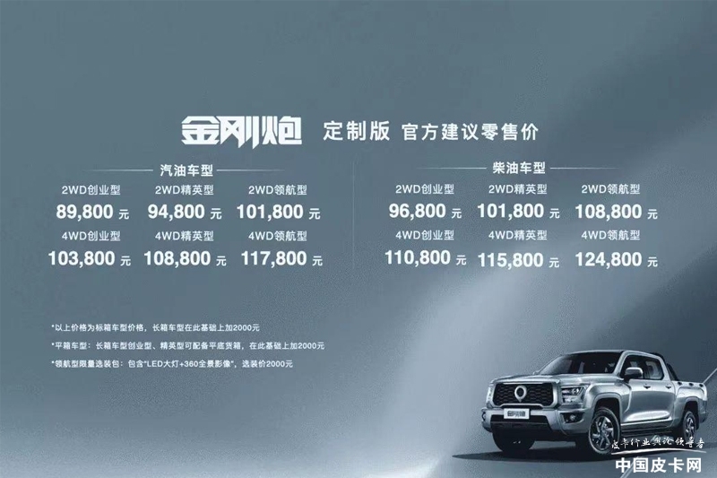 长城金刚炮定制版提供汽柴油两种动力共12款车型,长箱车型在此基础上增加2000元;创业型、精英型支持平箱车型,在此基础上增加2000元。