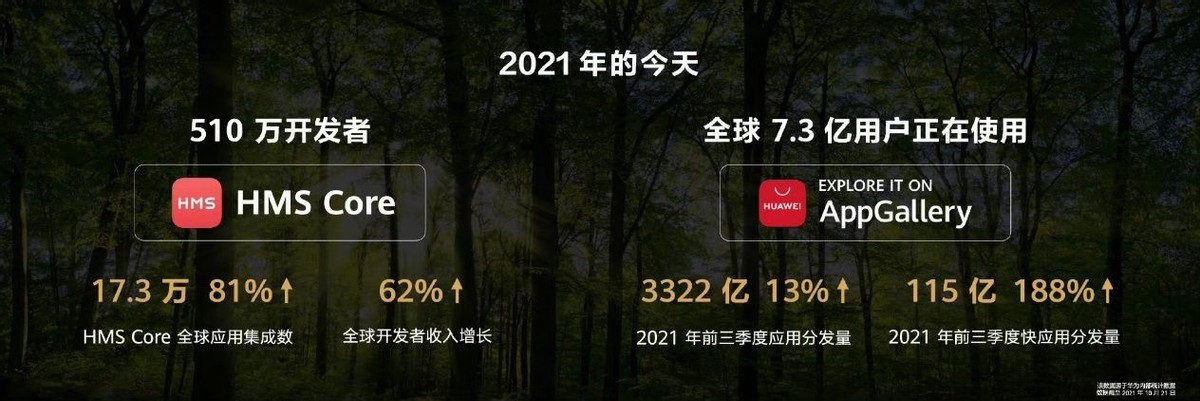 截至十月,全球集成HMS Core开放能力的全球应用已超17.3万个,同比增长81%;开发者注册数量已经超510万;华为应用市场AppGallery2021年前三季度的全球应用分发量超过3322亿次,快应用分发也超过115亿次,覆盖全球170多个国家和地区。目前华为HMS生态突飞猛进,已成为全球第三大移动应用生态,不难看出华为除了对芯片产业链的奋起直追,也对移动服务发展的加速毫不松懈。