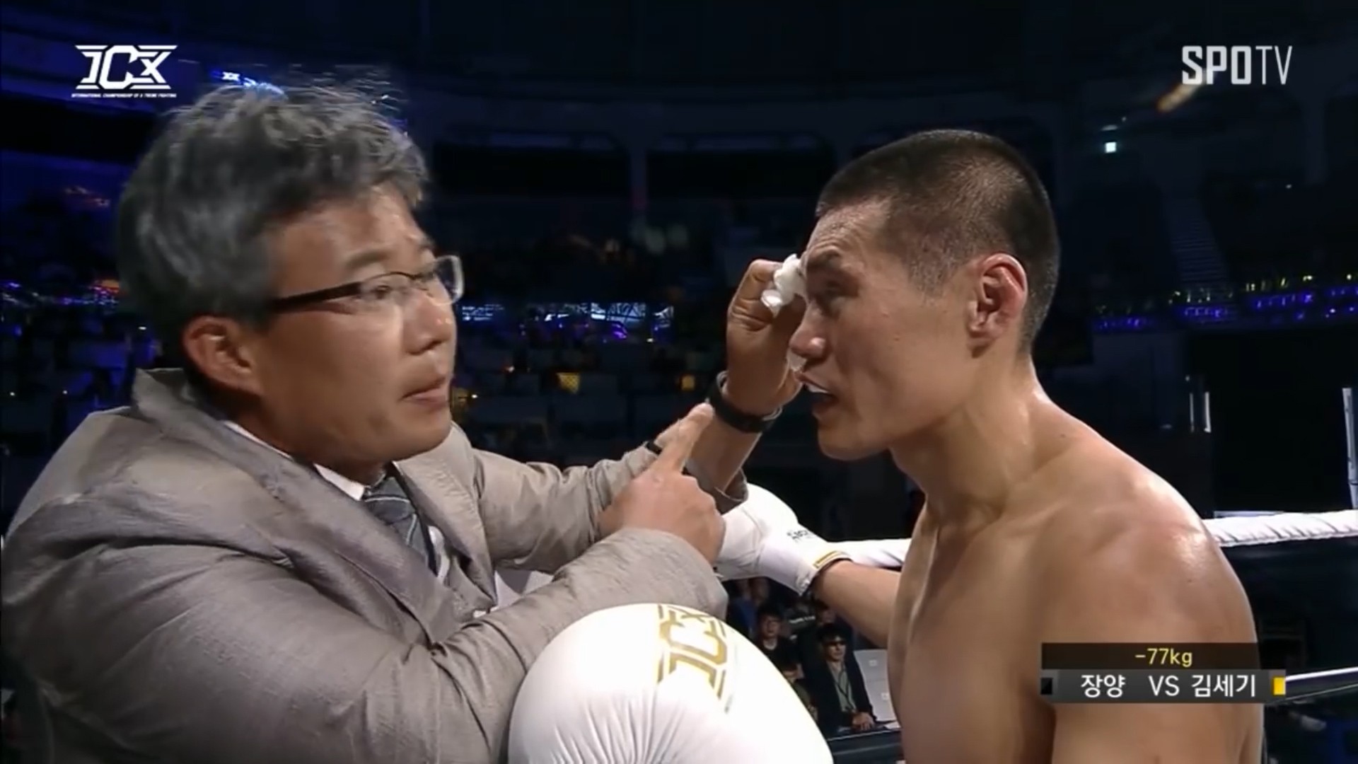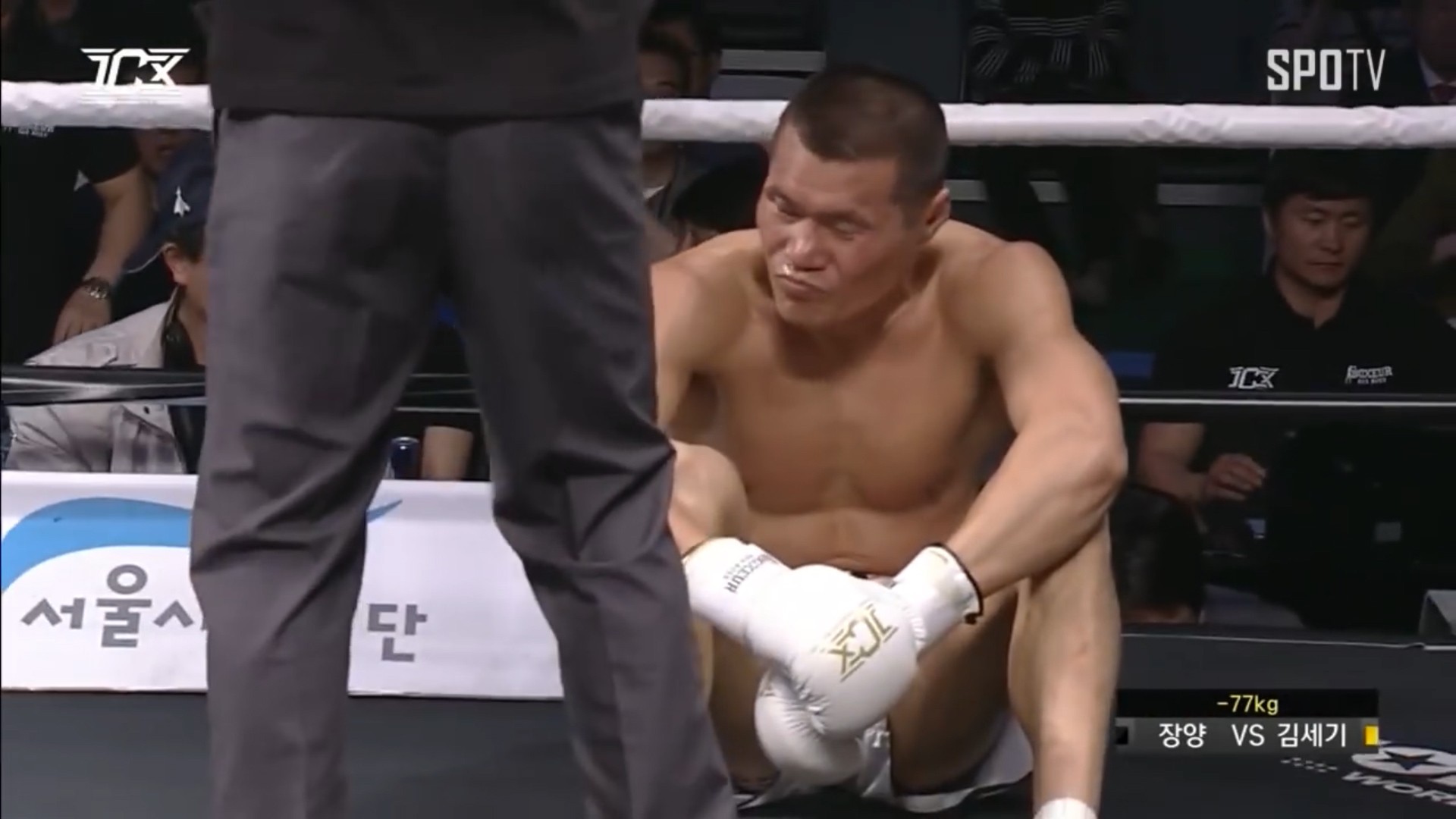 比赛来到第二回合,张扬开局就发动了猛烈的进攻,直接打的金世基叫医护上场,眼睛都险些打瞎掉一只。在经过短暂的治疗之后,比赛继续进行。张扬继续发挥勇猛的作风,重拳直接打的金世基坐地上。此时的裁判还犹豫了一下,估摸着还想作弊吧!然而见事不可为,金世基实在没有作战的能力,只能无奈宣布比赛结束了。就这样金世基又遭中国山东硬汉KO了!