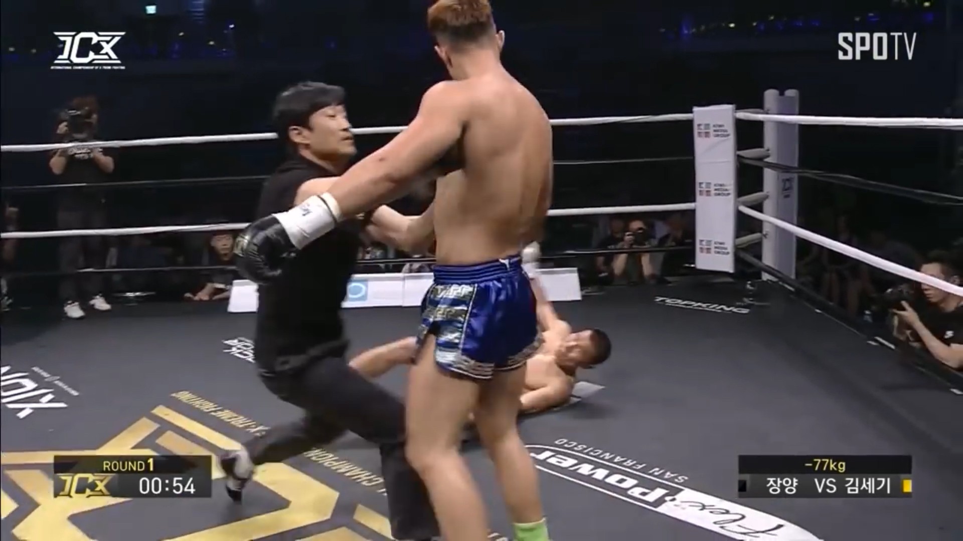 比赛刚开始,双方经过短暂的试探,直接就进入白热化的对轰状态。要说这位韩国的勇士,实力还是非常不错的,开局就发动了猛烈的攻势,拳腿组合一度压制住张扬。场面对于张扬来说是极度不利的,但是咱们的张扬并没有因此慌了手脚,表现得非常沉着冷静,密不透风的防守同时,也在伺机找机会反击。就在比赛还有一分钟结束的时候,张扬一个出其不意的左勾拳加右手刺拳,直接给予金世基重击读秒。这对战机的把握让人眼前一亮。然而事情并没有这么简单,好戏上场了。韩国裁判又开始故伎重施,乌龟一般的读秒速度,是不是似曾相识啊(死神方便读秒金世基也遭裁判龟速读秒偏袒)。短暂休息过后,张扬立马抓住机会乘胜追击,让人遗憾的是,比赛的时间到了,第一回合钟声敲响,张扬失去KO的机会,这也让让金世基逃过一劫。