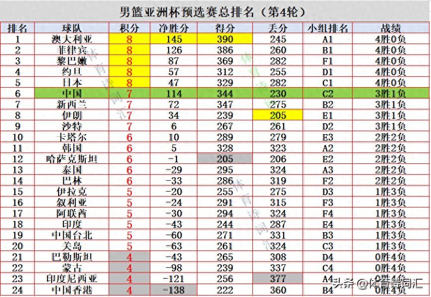 四轮战罢,5队全胜积8分直接晋级,4队全败小组垫底但也没有被淘汰出局,净胜分最多的是澳大利亚,4场赢了145分,其次是菲律宾的126分以及中国的114分。净胜分最少的是垫底的中国香港,一共输了138分。