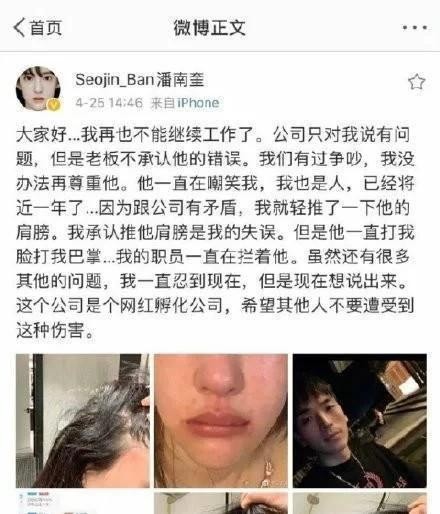 近日潘南奎被打事件曝出后也是引起无数网友的关注,根据潘南奎的描述,她和公司老板一直有分歧,而在一次争吵中潘南奎推了老板一下就遭到对方的暴力殴打,而且根据描述,潘南奎在公司中可能遭受不公待遇长达一年之久,直到这起事件发生后才敢于发声。