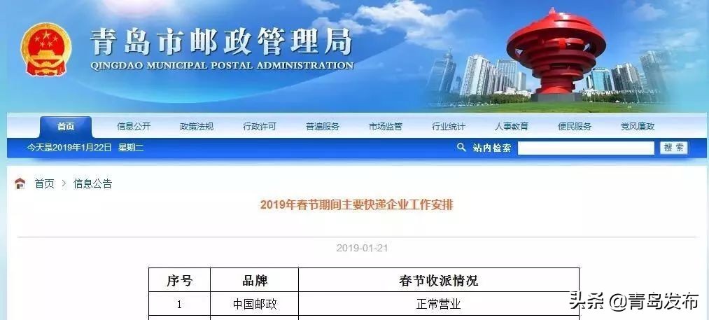 小编从青岛市邮政管理局官网了解到,1月21日,2019年春节期间青岛主要快递企业工作安排出炉~