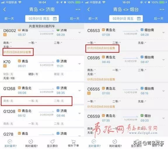 △12306软件显示的售票信息,左为青岛→济南,右为青岛→烟台。