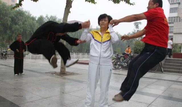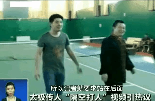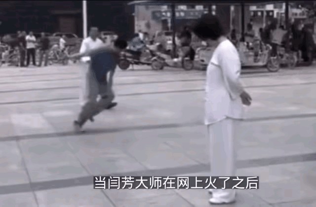 飘飘然的闫芳开始不满足自己的成就,竟然打起了歪门邪道的主意。2012年,在众多徒弟的怂恿和配合下拍摄了一则最强太极推手的视频,使用太极的“混元劲”可以隔山打牛,一掌打倒五六个弟子,而且都是被打飞3米开外。视频一出,震惊了武术界,CCTV还专门派遣记者前去调查了解,于是就有了图片所示的内容。无论经过多少实验,闫芳大师的徒弟们可以被打飞出去,记者同志却纹丝未动,可见闫芳大师的礼物没有送到位!