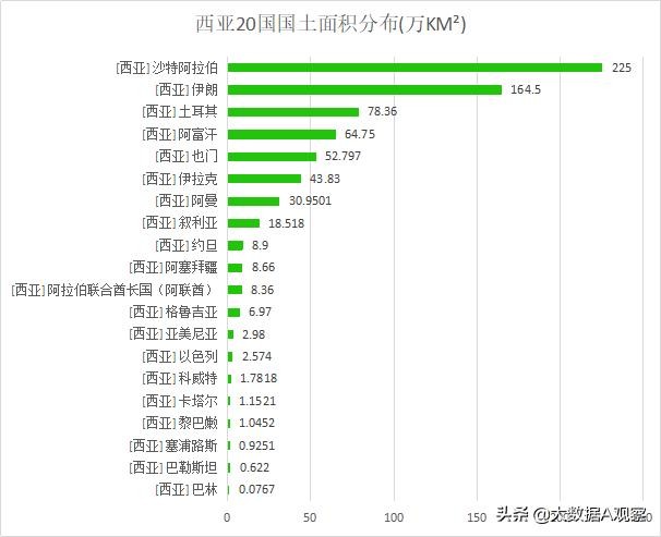 从西亚20国国土面积分布来看,国土面积分布最大的是[西亚] 沙特阿拉伯,其次为[西亚] 伊朗,随后依次为 [西亚] 土耳其、 [西亚] 阿富汗和 [西亚] 也门等;