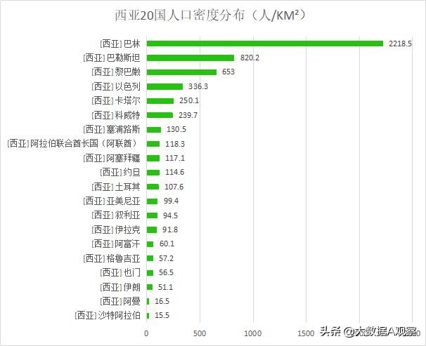 从西亚20国人口密度分布来看,人口密度分布最大的是[西亚] 巴林,其次为 [西亚] 巴勒斯坦,随后依次为 [西亚] 黎巴嫩 、[西亚] 以色列和 [西亚] 卡塔尔等;