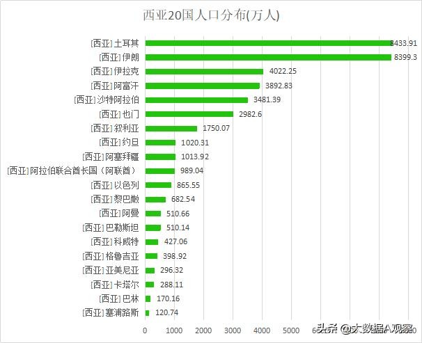 从西亚20国人口分布来看,人口分布最多的是[西亚] 土耳其,其次为 [西亚] 伊朗,随后为 [西亚] 伊拉克;