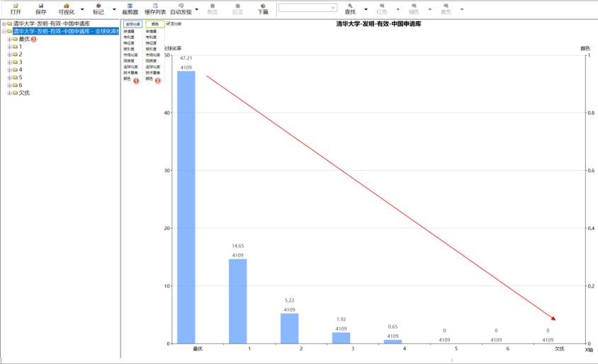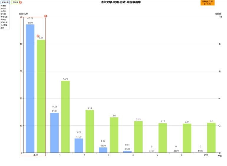 处于第一梯度(最优)的 4109 篇专利,其全球化率平均值为 47.21%。对应这些专利的同族度平均值为 8.31%。