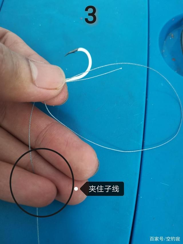 14.右手捏住鱼钩,左手开始慢慢拉子线(注:右手中指的子线不能打卷,打卷拉出的子线会损伤不直)