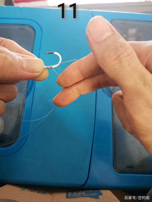 10.绕到鱼钩下方子线又顺时针转一圈又直接绕鱼钩,重复动作绕鱼钩5~10圈
