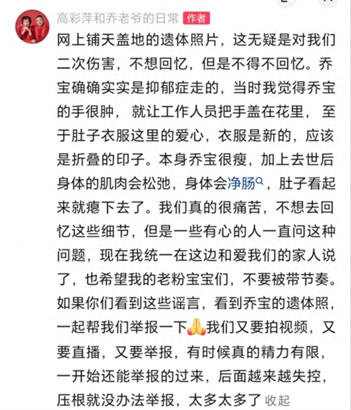 最近,关于乔任梁的真正死因被广大网友质疑,而且乔任梁的遗体照片也在网络上疯传,在10月30号思子心痛的乔爸爸乔妈妈,迫不得已,在社交平台上澄清:确确实实是抑郁症走的,网上铺天盖地的遗体照片,对我们造成了二次伤害,不想回忆,但是不得不回忆,呼吁广大网友,不信谣不传谣。