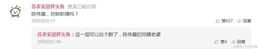 大概觉得“近水楼台先得月”,网友们脑洞大开,比如开始追问颜值代表之一的陈伟霆是否招女助理。地址显示是 黑龙江哈尔滨的网友“苏幸安是胖头鱼”直接开问:陈伟霆,你缺助理吗?并引来657人点赞。