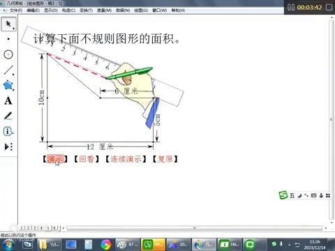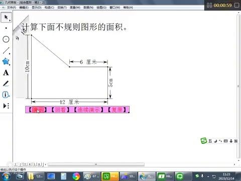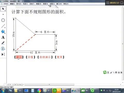 ·下面来看一下我的第四种想法。我的第四种想法是这样的,看图,然后这样画,不难发现我现在的想法是把它添了一个梯形,也就是变成一个大的长方形,再去减去我增加上去的梯形,所以我先求出增加的梯形的高是十减五等于五厘米,然后算两个图形的面积,一个大的长方形面积是一百二十平方厘米,梯形面积是四十五平方厘米。