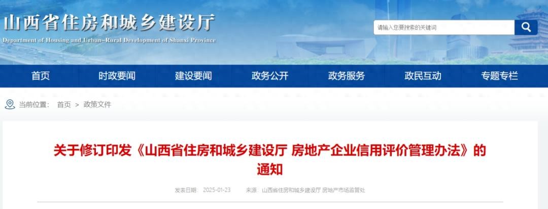 为进一步完善山西省房地产市场信用管理制度,规范房地产企业经营行为。日前,山西省住房和城乡建设厅发布《关于修订印发〈山西省住房和城乡建设厅房地产企业信用评价管理办法〉的通知》(晋建房规字〔2025〕17号),对房地产企业信用评价管理办法进行了修订和完善。新办法自2025年2月22日起施行,有效期为5年。