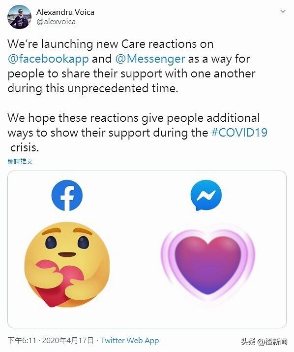 早前Facebook通讯经理Alexandru Voica在个人Twitter上已发布相关符号,他表示现时为了防疫,民众必须减少社交接触,因此希望透过温暖关怀的表情,鼓励用户携手共度防疫难关。