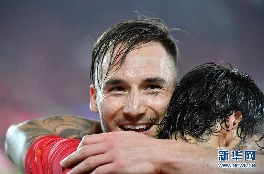 ↑3月6日,广州恒大队球员古德利(左)与高拉特拥抱庆祝进球。新华社记者刘大伟摄
