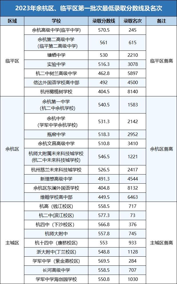 2023年余杭临平第一批次最低录取分数线及名次