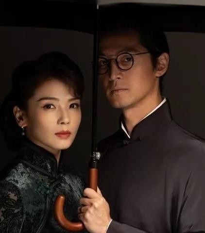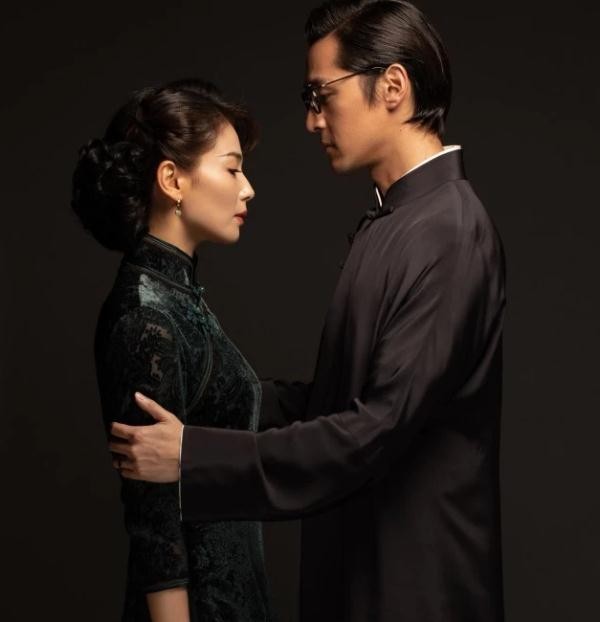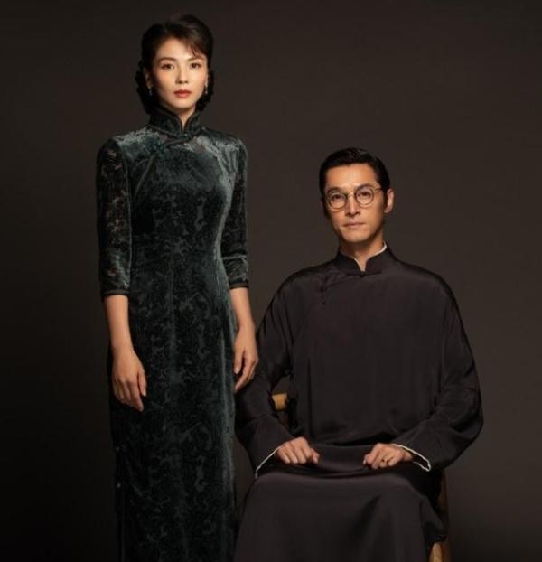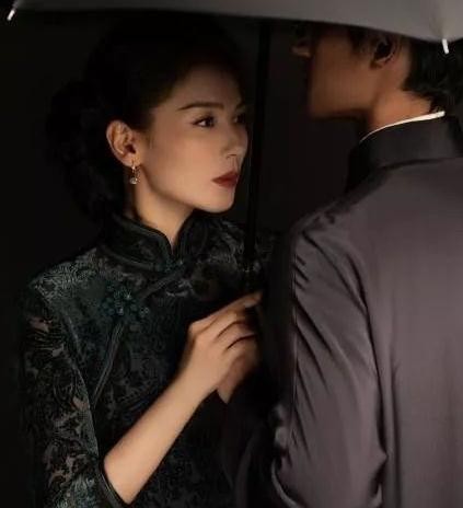 这组民国风的剧照格调很高,虽然背景和两人的穿搭都是以深色为主,渲染了一种沉稳和大气的氛围,民国风的特色就是以深色塑高级,刘涛的这一身墨绿色丝柔镂空绣花旗袍就展示了民国时期的富家太太穿搭。