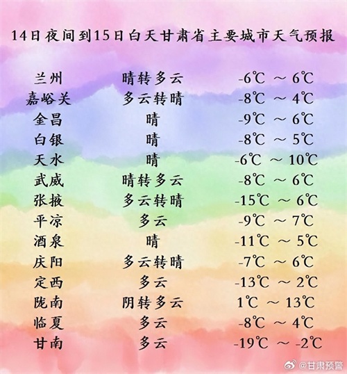 2月14日夜间到15日白天,甘南、定西、陇南三州市多云,部分地方阴有小雪(雨)或雨夹雪;省内其余地方晴或多云,其中河西五市及白银、庆阳两市有4至5级西北风,局地伴有扬沙或浮尘;