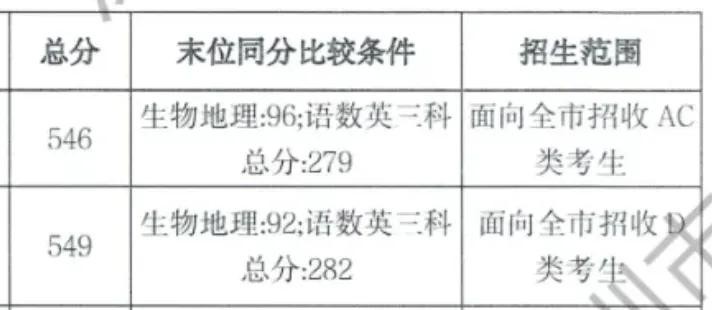 同样以图示学校为例,AC类考生中考总分546分,生地97分,则被录取。
