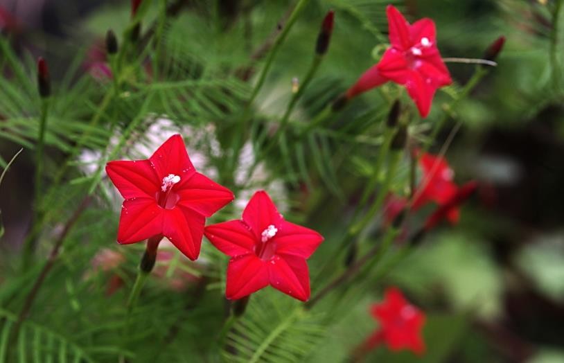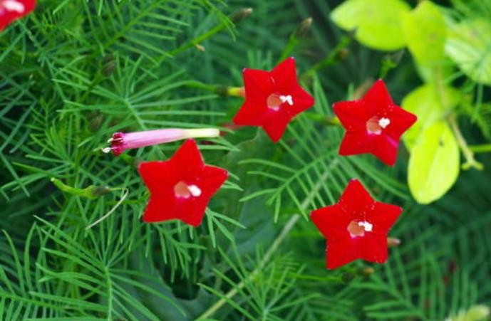 茑萝,原产墨西哥,又名密萝松,俗称五角星花、狮子草。《诗经》云:“茑为女萝,施于松柏”,意喻兄弟亲戚相互依附。茑即桑寄生,女萝即菟丝子,二者都是寄生于松柏的植物。茑萝之形态颇似茑与女萝,故合二名以名之(又名茑萝松(花历百咏、植物学大辞典)、羽叶茑萝、锦屏封(中国高等植物图鉴)、金丝线(广西)、游龙草、绕龙花。)花期长,在我国、安徽、湖北、湖南一带花期能从每年的四月至十一月。对土肥要求不高,撒籽于湿土上即可发芽,发芽率达95%以上。