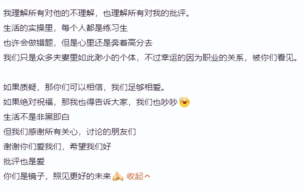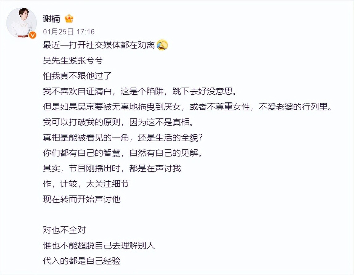 于是网络出现了一拨人劝谢楠离婚,最近谢楠的回应火了,其实我觉得谢楠的回应还是很有智慧的。